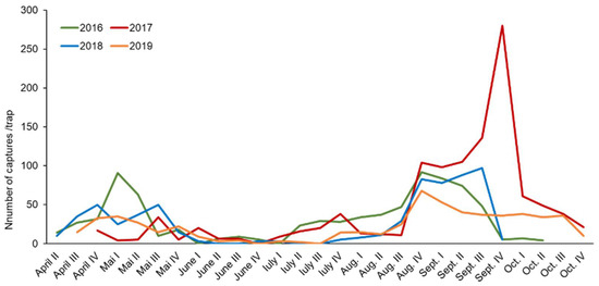 The maximum of the flight curve of G1 was registered on 30 April 2018 (92 moths/trap—April III). For G2, the maximum number of captures was observed on 15 July 2017 (58 captures/trap—July III), and for G3, the maximum captures value was reached on 30 September 2017 (280 moths/trap—Sept. III) (Figure 4). Even though G1 had a lower number of captures in 2017 than in other years, G3 registered a record number of captures in 2017. This variability is due to the climatic conditions of each year. The year 2017 recorded the lowest amount of precipitation without being classified as a dry year. The months of August and September (2017) had quite small amounts of precipitation, which we consider to have favored the development of G3 of L. botrana. In fact, every year, towards the end of September, a more intense activity of L. botrana males was noticed.