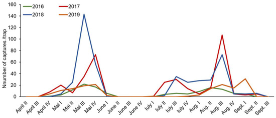 Due to the fact that the highest number of L. botrana captures was observed in the Sânmiclăuș plantation on the Sauvignon plot (SNSB), the data recorded in this study area were used to build the annual flying curves. L. botrana monitoring took place during the vegetation period of each year (Figure 4). In the same way, for E. ambiguella were used the data from Tăuni plantation—Sauvignon plot (TSB). E. ambiguella ended flight activity at the end of September, which was earlier than L. botrana (end of October).