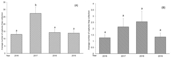 Taking into account the two species of moths, and following studies and analyses, the results showed that in the four years of study, they had different behaviors depending on the manifestation of climatic conditions. Analyzing the results from the four years, the L. botrana species registered significant differences between the number of captures in 2017 (p <0.05%) compared to the number of captures in 2016, 2018 and 2019 in the sense that the highest number of captures was in 2017 (Figure 6). The year 2017 registered the lowest amount of rainfall, which may prove to be the most favorable year for the evolution of L. botrana. In 2016, there was a higher amount of precipitation and a lowest number of captures; thus, we consider that it was a year with less-favorable climatic conditions for the development of L. botrana.