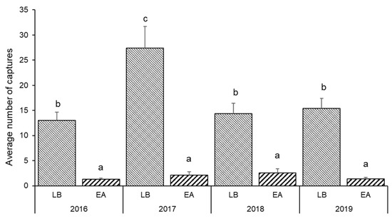 Average number of L. botrana (LB) and E. ambiguella (EA) captures/trap/year. (The variants with different letters are statistically different (p < 0.05); the differences of the variants with the same letter are statistically insignificant.)