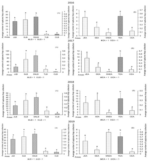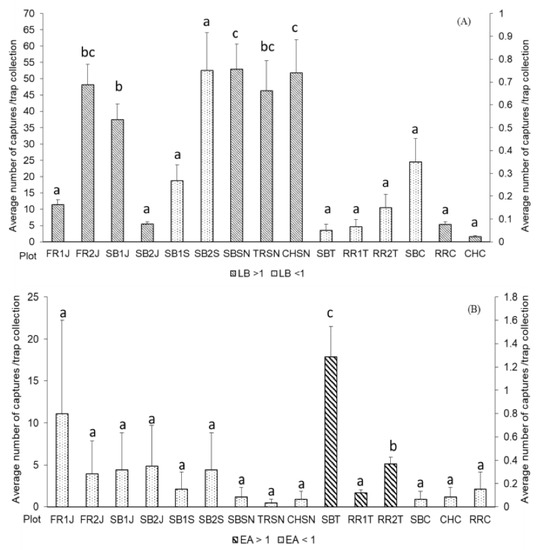 Average number of L. botrana (A) and E. ambiguella (B) captures/trap/plot. (The variants with different letters are statistically different (p < 0.05); the differences of the variants with the same letter are statistically insignificant; on the OX axis are represented the number of captures >1 and on the OY axis the numbers of captures < 1.)