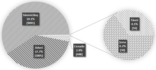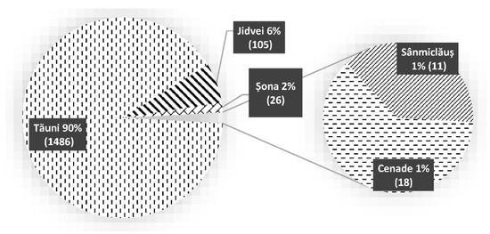 Regarding the distribution of the two species of moths in the five plantations studied, the results show large differences from one vineyard to another, keeping approximately the same proportions each year. In the 4 years of study, the highest number of captures of L. botrana was registered in Sânmiclăuș plantations (9091, representing 59.1% of the total L. botrana captures), and the smallest number of captures was registered in the experimental plots of Tăuni (Figure 9). In Șona and Tăuni plantations, L. botrana was almost nonexistent, and this may be due to the altitude, the exposure to direct sunlight, or the soil management.