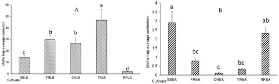 Average number of L. botrana (A) and E. ambiguella (B) captures/trap/cultivars, (The variants with different letters are statistically different (p < 0.05); the differences of the variants with the same letter are statistically insignificant.)