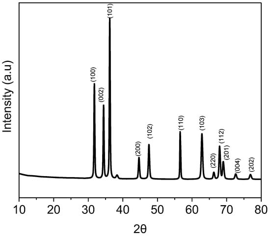 ZnO nanoparticles’ structural consideration, elemental composition, and phase purification as prepared were examined via the X-ray diffractometric technique. The X-ray crystallographic features of synthesized zinc oxide nanostructures are displayed in Figure 1. All the characteristic diffraction patterns describe the crystallographic planes at (100) and (002), while the other supported patterns at (101), (102), (110), (103), (200), (201), (112), (004) and (202) represent the pure phase and high crystallinity of the ZnO nanostructures [33,34]. Furthermore, Figure 1 shows that the ZnO diffraction patterns were hexagonal (wurtzite), which is identical to the reported structure (JCPDS No. 36–1451). The positions and strengths of the diffraction peaks match between them. As a result, the synthesis of ZnO in a hexagonal wurtzite form was confirmed [35]. Additionally, all these patterns are referred to as ZnO nanostructures with no indication of other impurities. Using the Debye–Sherer Equation (2), the average size distribution of ZnO nanostructures was determined.