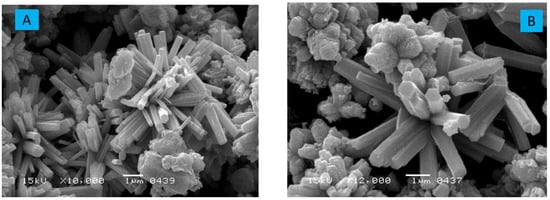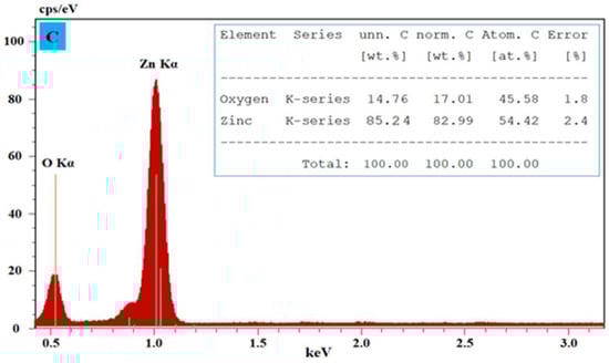 The surface morphology of the ZnO nanostructure was examined using the advanced characterization tool scanning electron microscope (SEM), as indicated in Figure 2A (10,000× resolution) and Figure 2B (12,000× resolution). According to the latest research, ZnO NPs are rod forms and conglomerations of nanocrystallites. The SEM was exploited to measure the morphology and roughness of engineered nanostructures. Figure 2A,B clearly show elongated particles with rod-like nanostructure and highly porous surfaces, which makes them a suitable candidate for catalytic reactions [39]. Moreover, to examine the elemental compositions and high purities of the engineered material, SEM coupled with EDX analysis was employed as displayed in Figure 2C. The EDX spectra provide evidence that zinc and oxygen atoms are present in high elemental percentages, respectively. No other element impurity is present in the EDX spectrum, which reveals the high purity of the as-prepared material [40].