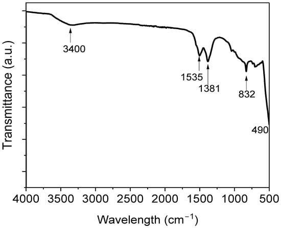 FT-IR research was performed on the synthesis of zinc nanoparticles to discover the numerous distinctive functional groups associated with the generated nanoparticles (shown in Figure 3). The peaks represent the functional groups contained in the produced zinc oxide nanoparticles. The main absorption peaks were found in the lower wavenumber range. The O–H stretching mode of hydroxyl groups is represented by the broadband at 3400 cm−1. In the protein amide links, the highest intensity at 1634 cm−1 revealed amine (–NH) vibration stretching. Alcohols, phenolic groups, and C–N stretching vibrations of aromatic amines in biomolecules were reflected by the strong bands found at 1385 cm−1. The Zn–O stretching bond is represented by a distinct band at 830 cm−1 [41]. The FTIR spectra confirm effective biomolecule capping on the NP surface, ensuring ZnO-NP stability and dispersion in aqueous conditions [42].