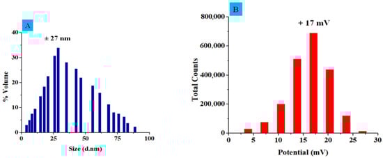 (A) Size of ZnO nanostructures around 27 nm. (B) Potential of ZnO nanostructures with about 17 ± 3 mV.