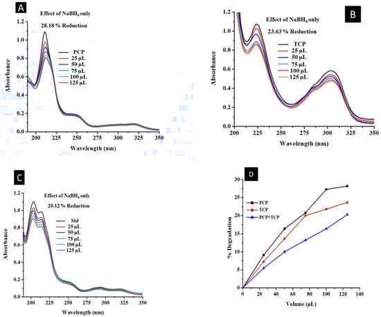 Absorption spectra of PCP and TCP individually (A,B) and simultaneously (C) with inset showing % degradation graph (D) in the absence of a catalyst using 25–125 µL NaBH4 (0.005 M).