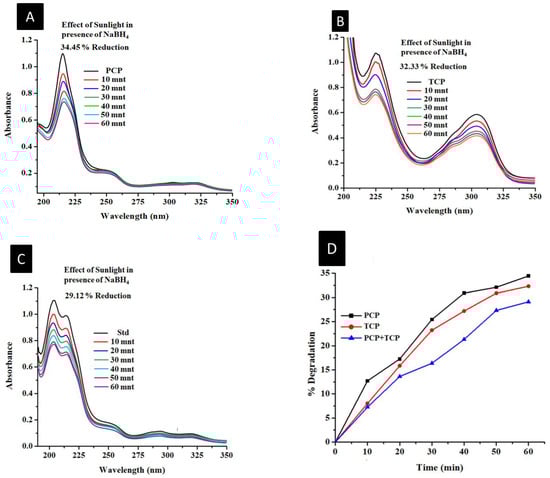 In addition to sodium borohydride (proton source) optimization, the sunlight effect appeared both separately and concurrently. For PCP and TCP, a discernible fluctuation in peak intensity was found during the usual period. As a result, 125 L of sodium borohydride was collected in quartz cells, and interacted for 1 h outside before spectra were eventually recorded. According to Figure 6A–C, there were deteriorations of about 34.45%, 32.33%, and 29.12%, respectively. However, no appreciable change was noticed when the solution was exposed to more sunshine radiation; just 1–2% was analyzed. Figure 6D shows the percentage of deterioration more clearly. Furthermore, it was unable to offer better results with a prolonged time of exposure because it was devoid of any means of capturing hydride ions. The issue was then resolved by the addition of ZnO nanostructures, which proved successful and offered sturdy support for the impressive adsorption of hydride ions that greatly reduced PCP and TCP [50]. Applying a reducing agent will increase deterioration and shorten the time it takes to complete the task, making it more effective and adequate.