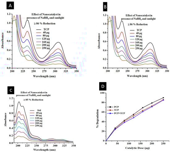 After adjusting the sodium borohydride and sunlight, the catalytic dosage coupled with the immediate proton must be maximized to determine the catalytic efficacy of the manufactured nanocatalyst. A test tube containing the appropriate amounts of PCP and TCP, and 125 L of NaBH4 was used to assess this stage. After 3 min in the sunshine, spectra were collected. For all individual and concurrent studies, the catalytic readings were kept within a target band of 250 g. It was discovered that the peak intensities of PCP and TCP were significantly effective. Figure 7A–C illustrate the estimated 90%, 86%, and 85% deteriorations that were experienced, and Figure 7D also displays a more precise degree of deterioration [51]. The development of sodium borohydride protons (H+), which are typically attached to the surfaces of nanomaterials, may be the reason for the increase in PCP and TCP degradation, thus enhancing the nanocatalyst activity. The catalytic regions on the zinc oxide surface expanded as the dose increased, speeding up the chemical reaction towards degradation [50,52].