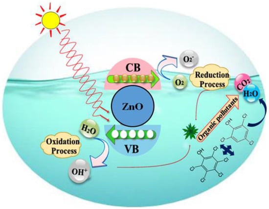 As ZnO nanoparticles interact with solar light to form a mechanical effect, a void is continuously created in the photogenerated surface and a particle is excited to the bandgap from the conductive band (shown in Figure 8). It is possible to recombine or interact independently with these solar-produced holes’ pairs of electrons. While oxygen deposited on the surface of the catalyst helps with building oxidant reactive protons, the holes it produces can interact and form OH radicals. In the end, an oxidized product was produced by subjecting the expected impurity to hydroxyl radical treatment (a strong oxidizing agent) [45]. Below is a summary of the entire sequential mechanism: