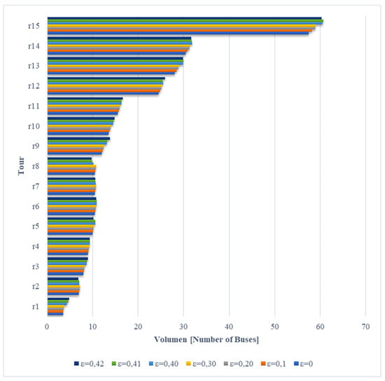 The indicator “Distance from the target value (Δ)” was created to measure the distance between the model’s obtained solution and the requested value or target value, which corresponds to λ = 1. It was calculated for both production and volume constraints. The problem was run several times in seeking to determine the resultant solutions of relaxing the parameters of productions and volume, one by one and simultaneously. All those cases were compared with this paper’s model’s proposed solution, in which the best performance was with ε = 0.42. For both production and volume, the FL model had smaller Δ values than the ones obtained in the no FL models, which means that the use of the fuzzy parameters undoubtedly improves the performance of the model, with better solutions. In a few of the links or nodes, some of the comparative cases scenarios could achieve a better Δ, but these are not relevant when in general most of them present strong differences in the indicator. When considering what is real, it is not always possible to fully comply with constraints. Planners and decision-makers must try to find an equilibrium, and these formulations can contribute to that point, decreasing the level of uncertainty. This is because the FL model allows one to obtain “satisfying solutions” instead of no solutions, when the deterministic problem is unfeasible. The inclusion of fuzzy logic with the entropy maximization approach to estimate bus tour flows significantly improves the quality of the results.