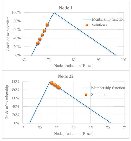 The proposed formulation objective is to optimize the entropy to obtain the most likely tour flows for buses—transit—applying fuzzy parameters with entropic membership functions, specifically the triangular membership function, which is used in the formulation. The x-axis represents value intervals containing the solution, which corresponds to the number of buses on the tour in each scenario, whereas the y-axis displays the success of the constraint membership. The membership functions’ shape selection, and the maximum and minimum values, obey the experts’ opinions. However, it is irrelevant for this research, because the important thing is to include data variability using FL in the model process. It is worth clarifying that in real life data, the intervals used in the membership function are defined by the minimum and maximum values observed in the traffic counts, whereas those of deterministic modeling correspond to the traffic counts’ average value. This entropy-based TTS model with fuzzy parameters follows the Gonzalez-Calderon and Holguin-Veras [24], López-Ospina et al. [10], and Moreno-Palacio et al. [28] formulations.