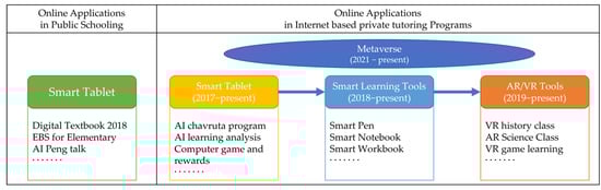 Subsequently, the COVID-19 pandemic hastened the practical implementation of these new forms of education and learning []. In many schools and universities worldwide, online learning has become common. This unexpected situation posed a major challenge for many education administrators, researchers, and practitioners. Education authorities and schools have had to build and put into practice a new system in a very short time without sufficient capacity to prepare teachers []. However, SE providers in South Korea were ready for that change because the industry had moved toward online learning before the COVID-19 pandemic. Online learning provided by SE has been chosen by many Korean students and parents [], and the pandemic strengthened the trend [].