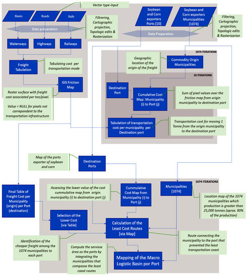 The model is developed to compute the least-cost routes from the origin—municipalities that produce soybean and corn—to the exportation ports, and then to compute the service area of each port by connecting all the origins whose routes flow to the port. Figure 3 illustrates a schematic overview of the process.