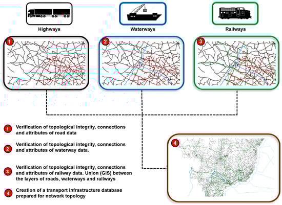 The transport infrastructure database provided by the EPL is not topologically ready for network analysis. Nevertheless, we use this database to feed the model inputs because they are the official public data containing both current transportation infrastructure and the one used by EPL to compute the scenarios presented in the PNL 2035. Figure 4 illustrates the database preparation for topological network analysis.