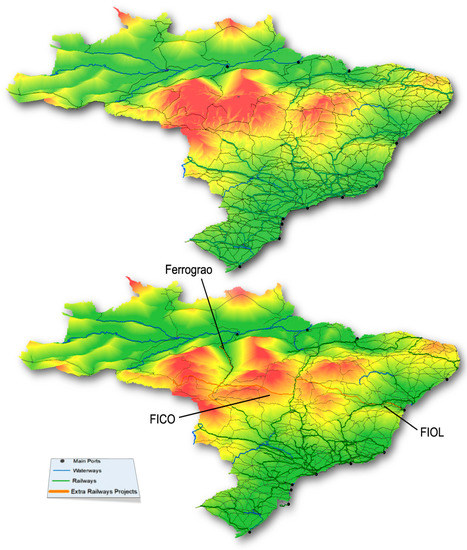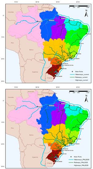 The objective of the investigation is to predict how the new transportation infrastructure proposed in PNL will rearrange the origin–destination matrix and reshape the macro-logistic basins of the Brazilian exporter ports. Therefore, we built a geographic-oriented model for predicting scenarios for routes and transportation costs, yet compiling and comparing the results of the current transportation infrastructure to the addition of new railway segments and highway rehabilitation proposed in the PNL. The model allowed us to: