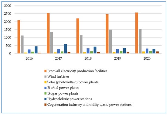 Electricity production (GWh) from RE sources in Lithuania (data from [8]).