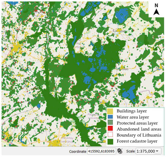 Water raster criteria were selected in accordance with the Order of the Minister of Environment of the republic of Lithuania, the approval of the order description regarding the establishment of protection zones and coastal protection bands for surface water bodies [32]. However, in Lithuania, different protection zones apply to different water bodies, ranging from 10 to 500 m. Therefore, the distance which apples for most water bodies in Lithuania was selected as the most suitable one.