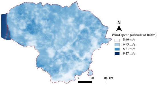 Evaluating that wind speed potential in Lithuania is not high enough to obtain the desired economic effect was oriented to WPP of 100 m and higher in this work. For this purpose, the used mean wind speed raster image from GWA in Figure 4 is at an altitude of 100 m.