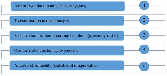 For the multi-criteria analysis, all vector data (points, lines and polygons) layers were transformed into a raster image, where pixels acquired values of 1 (for objects) and values of 0 (no objects). One pixel value was 10 × 10 m. An important consideration is that all rasters must be of the same extent, especially the coordinate system. For processing, the authors used the open-source software QGIS Toolbox vector conversion/rasterization (vector-to-raster) algorithm (Algorithm: gdal_rasterize).
