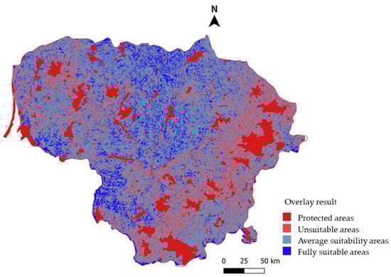 ALA in Lithuania cover about 373.6 km2 of the Lithuanian territory. This is only 0.57% of the total area of Lithuania or 1.1% of the total area of AL. Our results show that part of the AAL falls into the category of protected areas and cannot be used for WE, and part of the land was assigned to the category “no data”. However, the obtained results show that 26.2 km2 or 7% of the AAL are suitable for WE, 69.5 km2 or 18.6% of the AAL have an average suitability for WE, and 16.1 km2 or 4.3% of AAL are not suitable for WE.