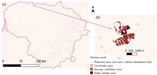 Figure 8a demonstrates different overlay results for AAL: unsuitable, average suitability and fully suitable are distinguished in different colors. This research was performed for the whole country, but AAL areas are hardly visible on a whole country map. For a clearer view, the magnified image (Figure 8b) of the selected territory was made. For the magnified image the area was selected in which all possible AAL suitability categories in different colors are visible: unsuitable, average suitability and fully suitable.
