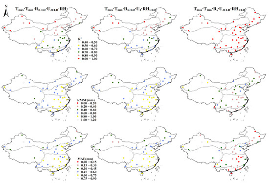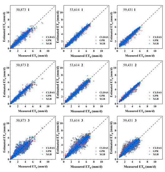 Overall, when we use the CLDAS data RHCLD or U2CLD instead of the measured data to estimate ET0, accuracy and stability are high. However, when there is a lack of local meteorological Rs data, the estimated results drop significantly (by about 5%~13.5%), but there is still a certain degree of accuracy. Therefore, the accuracy of the CLDAS RsCLD data is relatively low [39], which affects the estimation of ET0. These results are similar to the results reported by Liu et al. (2009) [49] and Fan et al. (2019) [50]. This may be due to the immature radiation simulation mechanism of the CLDAS and the severe air pollution in the areas mentioned above, which pose certain challenges in respect of obtaining accurate simulations [18]. Therefore, we propose using the corresponding CLDAS data instead of local meteorological data to predict ET0 when the local meteorological RH or U2 data are missing; when the Rs data are missing, we can use machine learning methods to predict ET0. Furthermore, we selected three meteorological stations in different climate zones and compared the ET0 estimated by the three methods with the measured ET0, as shown in Figure 2. It can still be found that the scattered points of combination 1 and combination 2 are more concentrated, and the estimate for combination 3 is even worse.