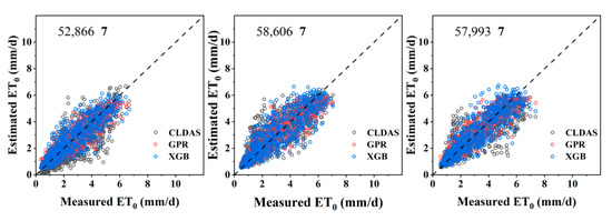 As far as the results of estimating ET0 are concerned, the overall results for the CLDAS are good, especially for air temperature data; these results are the same as those of Liu et al. (2021) [32], but the estimation accuracy is not as good as the machine learning methods in some cases. This is due to the instability of the accuracy of the CLDAS RsCLD data [18], which has a particularly negative impact on the results when estimating ET0; subsequent bias correction can be performed on the CLDAS data, which may improve the prediction results [58]. However, in the current situation, we do not recommend using the CLDAS data instead of local meteorological Rs data.
