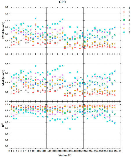 Under combination 7, when the local Rs, U2 and RH data are missing, and the CLDAS RsCLD, U2CLD and RHCLD data are used to replace them to estimate ET0, the performance of the three methods decreases compared to the case where two meteorological data types are missing. The performance of the XGB (R2 = 0.741) and CLDAS (R2 = 0.740) methods is relatively worse. The GPR method performs better (R2 = 0.791, RMSE = 0.753 mm/d, and MAE = 0.559 mm/d). Compared to combination 4, the estimated performance of the three methods decreases by about 5% under combination 7. Therefore, we propose the use of the machine learning method GPR to estimate ET0 when only temperature data are available. In addition, we selected three stations and compared their estimated ET0 with the measured ET0, as shown in Figure 4.