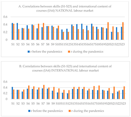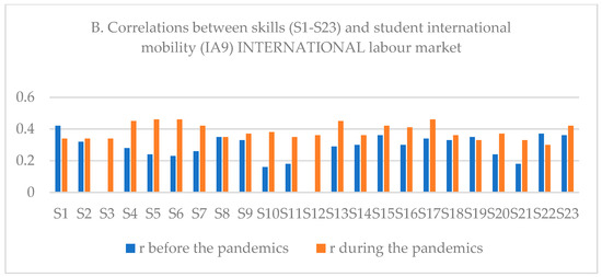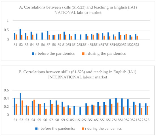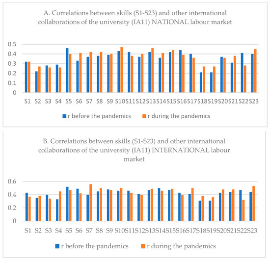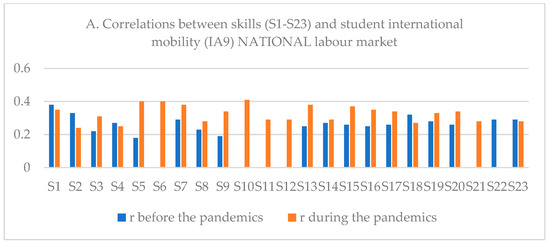 The correlation between the skills identified as being offered by the university and the actual internationalization activities conducted were analyzed from the perspective of competences needed for both the national labor market and the international labor market. The analysis was conducted for both periods of time: before the COVID-19 crisis (group 1) and during the COVID-19 crisis (group 2). From the 11 HEIs’ internationalization activities were selected for analysis those activities that were perceived as being related to the resulting skills and abilities, in the opinion of students, for which the correlations were statistically significant. These are: IA1 = Intensive English courses/or subjects taught exclusively in English, IA4 = International topic of the courses/or providing international professions for the students, IA7 = Extracurricular activities promoted by the HEI, IA9 = Student mobility, IA10 = Professors and staff mobility, IA11 = Other cross border activities such as collaboration with international students, professors, researchers to develop transnational programs or transnational internships in order to provide competences for students. Figure 1A,B, Figure 2A,B, Figure 3A,B, Figure 4A,B and Figure 5A,B and Appendix B and Appendix C present the correlation coefficients between each acquired skill and a number of HEIs activities (interpreted as the strength of the relationship existing between variables) for both types of labor markets (national and international) and in both periods of time (before and during the pandemic).