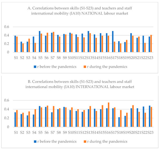- For activity IA11 (Other cross border activities such as collaboration with international students, professors, or researchers to develop transnational programs or transnational internships in order to provide competences for students), the intensity of correlations with the national labor market were lower for both periods (before and during the pandemic) as compared to the international labor markets. This is one of the activities for which the levels of correlation remain similar before and during the pandemic for all skills.