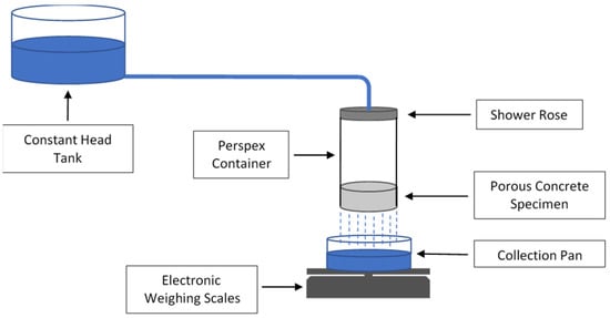 To prevent water seepage around the edge of the specimen, its vertical sides were covered in plastic wrap before installation in the perspex container. The dry mass of the specimen was also recorded. Water was then distributed across the concrete specimens via a 300 mm diameter shower rose. The perspex container was sub-divided into an empty upper chamber, while the lower chamber contained the concrete specimen. This enabled the removal of the specimen while the flowrates were set. Once the flowrate was set and the specimen replaced, the time taken for water to penetrate through to the lower horizontal surface of the specimen was recorded. Electronic weighing scales (Model: ACS-HY-809B; Accuracy: ±5 g) recorded the mass of water seeping through the porous concrete specimens. At the completion of each test, the specimen was immediately removed and its wet mass recorded.