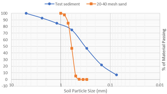 Sediment for the clogging experiments was prepared with the particle size distribution (PSD) shown in Figure 2. The test sediment was composed of quartz sands of various particle sizes and was developed to represent a typical PSD for the Xi’an region. The PSD for the quartz sand used in the preparation of the porous concrete samples is also included in Figure 2 for comparison.
