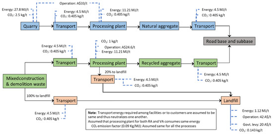 In terms of sustainability, the benefit-cost ratio (BCR) of using recycled aggregate (RA) collected from the cleaning of porous concrete systems in place of virgin fine aggregates in the manufacturing of new PICPs was assessed by conducting a full life cycle analysis (LCA), using the method developed by Rahman et al. [21]. The life cycles of virgin aggregates (VA) and recycled sediments, including the costs associated with each stage of the process, the ensuing energy consumption as well as the CO2 emissions are shown in Figure 5. Virgin aggregates are assumed to be extracted from a quarry and then processed before use in the manufacture of porous concrete. The recycled sediments are collected from the cleaning of partially clogged porous pavement installations. The collected sediments are processed and graded in a recycling plant before use in the manufacture of porous concrete.
