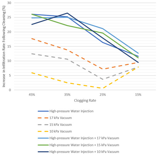 From Table 5, the best cleaning performance over the range of clogging rates was high-pressure water injection combined with the highest-pressure vacuum, which produced an average increase in infiltration rate of 20.9%. High-pressure water injection by itself displayed the third best performance, although in practical terms the increased cost of adding a vacuum cleaning method would have to be considered.