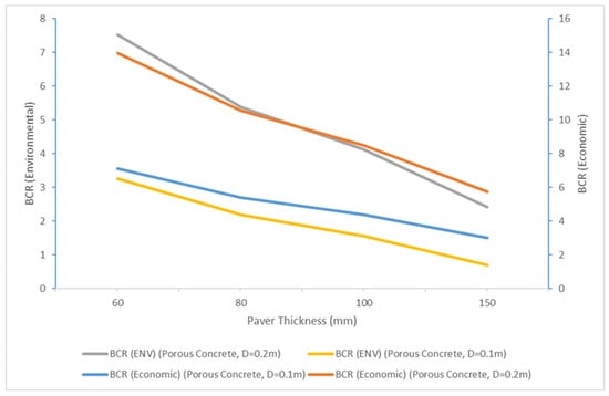 Figure 9 shows the economic and environmental BCRs associated with using recycled aggregates in the manufacture of four paver blocks (with thicknesses 60 to 150 mm) compared to using virgin aggregates used in the construction of two porous pavement thicknesses (100 mm and 200 mm). In Figure 9, both economic and environmental BCRs have a decreasing trend with increasing paver thickness. However, the rate of change in environmental BCR is higher than in the economic BCR, indicating the importance of using less materials in order to gain environmental benefits. This is possible with PICP because the concrete mix is stronger than that which was used in the construction of porous concrete.