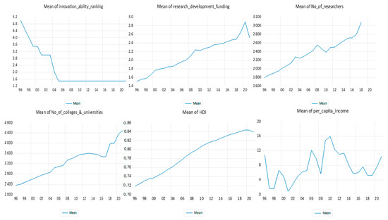 Panel graphical representations of universities’ innovation ability ranking point, research and development funding, number of researchers engaged in research and development, number of colleges and universities, human development index, and per capita income are shown. Source: authors’ computation.