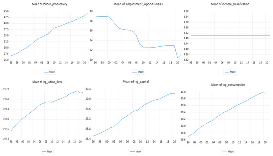 Figure 2 shows the graphical representations of the variables for achieving the third objective of the study, namely labor productivity, employment opportunities, income classification of the countries, labor force, capital, and consumption. From the figure, labor productivity shows a consistently upward trend, even in recent years. Employment opportunities show a declining trend; however, they are on an upward trend in recent years. The income classification of the countries is a constant trend throughout the period. The labor force shows an upward trend throughout, even in recent years. Capital and consumption show a similar upward trend, even in recent years.