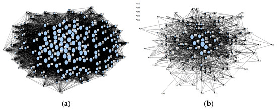China’s 2018 input–output network map of 153 sectors. (a) Weak relationship (more than 100 million yuan) input–output network. (b) Strong relationship (more than 10 billion yuan) input–output network.