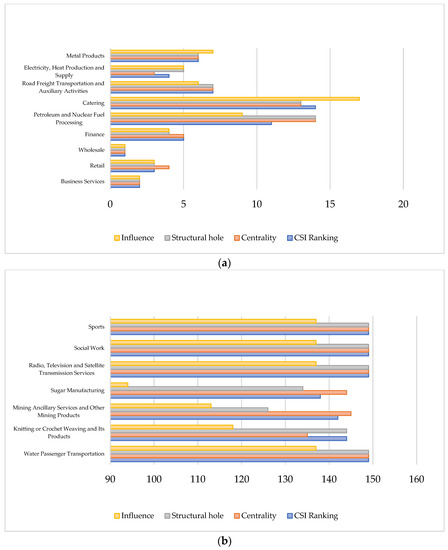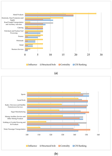 The relationship between the comprehensive position ranking and sub-item ranking of subdivided industrial sectors in the weak relationship input–output network in 2018. (a) Among the top 20 industrial sectors in the three relationship networks. (b) Among the bottom 20 industrial sectors in the three relationship networks.