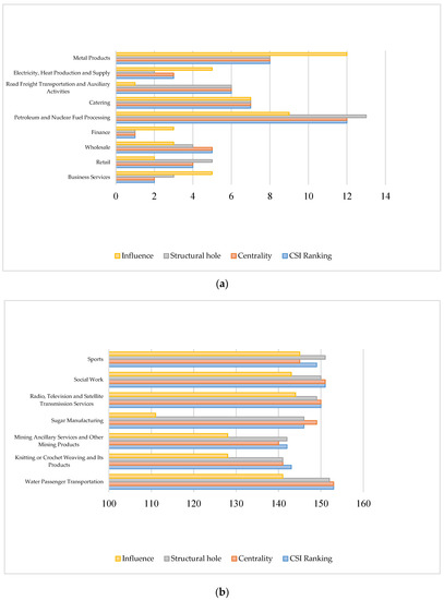 Firstly, for the most important industrial sector in the input–output network (i.e., the industry sector ranked top 20 in all the three networks), producer services, especially road cargo transport and transport auxiliary activities, ranked higher than the other indicators in terms of influence. Road freight transport and transport support activities rank 2nd and 1st, respectively, in the weak and relatively strong relation networks, although their overall position ranks 8th and 6th (Figure 2a and Figure 3a). It can be found that the importance of services is largely due to the large amount of material or product (both tangible and intangible) input they make to a large number of other industrial sectors, thus bringing strong spillover effects.
