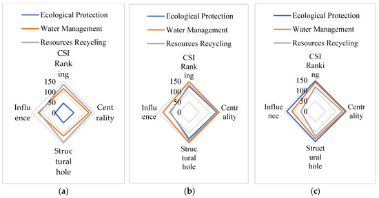 Finally, for those representative industrial sectors that are conducive to resources, ecology, and environmental protection, although their ranking of influence is slightly higher than that of other indicators (Figure 5), the impact of these industrial sectors is far from reaching the “dual carbon” goal and meeting the need for sustainable development. The degrees of influence and being affected were relatively low, especially for the latter. This shows that other industries have quite little investment in eco-environmental protection industries. Due to insufficient resources and funds, these industries have developed poorly and, therefore, cannot provide a role to their positive environmental externalities.