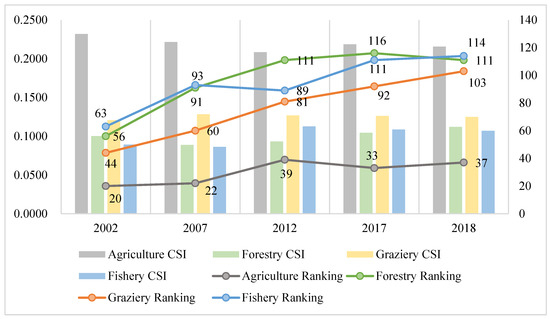 In the primary industry, compared with the other three subsectors, the comprehensive status index and ranking of agriculture have been far ahead, and the ranking decline is relatively small. However, recent studies [37] have found that agricultural production (including planting and animal husbandry) and land use change are also major sources of greenhouse gas emissions, which account for approximately 25% of the total global greenhouse gas emissions. Agriculture may not seem to account for a large proportion of emissions compared to fossil fuels. However, the fact is that emissions from agricultural activities are inevitable, especially from grains and beef due to their dominant positions in people’s diets. These bring about the largest total and the largest unit intensity of agricultural emissions, respectively. Therefore, the achievement of current international climate goals may depend on significant reductions in agricultural emissions, which will require new demands for improved agricultural production technology and policies.