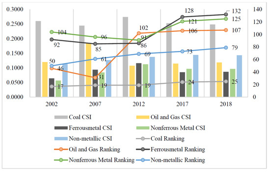 Changes in the comprehensive status index and ranking of the five subdivided industrial sectors of the mining industry.