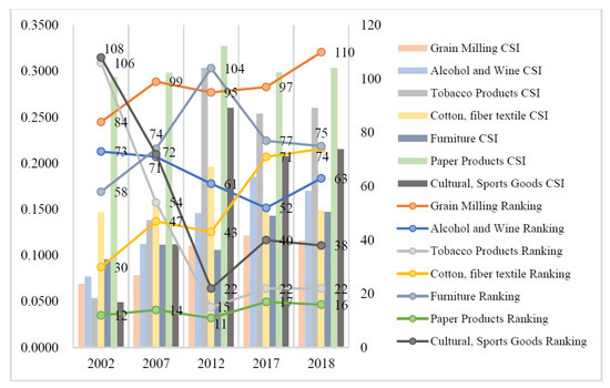 Figure 8 shows the large status gap between the subsectors of the textile industry. While some sectors rank quite high (e.g., paper and paper-related products), some sectors rank quite low (e.g., grain mill products). The changes in the status of the different industrial sectors vary. While the status of some industrial sectors has been declining (e.g., cotton, chemical fiber textiles, and printing and dyeing finishing products), the status of individual industrial sectors has risen sharply (e.g., tobacco products, culture education, sports, and entertainment products).