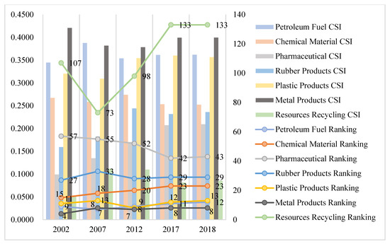 As can be seen in Table 5, the financial sector tops the list of industries. Resource-consuming industries, represented by coal mining, as well as high-energy-consuming and high-polluting industries, such as electricity and heat production and supply, refined petroleum and nuclear fuel processing products, metal products, and plastic products, still occupy an important position in the Chinese economy. Environmental resources and public facilities management, social security and social welfare, and railroad transportation and urban rail transportation equipment have a lower position in the Chinese economy. Agricultural products, forest products, and livestock products have the lowest position in the Chinese economy.