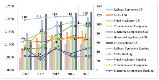 Generally, the industrial status of machinery and electronics manufacturing is mostly at the middle level, and the range of fluctuations over time is not significant. In particular, the status of electronic components, instruments, and meters is relatively high; that of railway transportation, urban rail transportation equipment and metal processing machinery is relatively low; and the industrial status of household appliances has shown a significant decline in the past 10 years. The changes in the status of the machinery and electronic manufacturing sub-industry sectors, as shown in Figure 10, reflect the continuous increase in the added value of China’s manufacturing products, the steady increase in technology intensity, and the continuous rise of the industrial value chain.