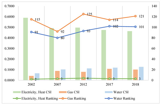According to the existing literature, the industrial structure is closely related to economic efficiency, economic stability, carbon emissions, and sustainable development. The following are the results of the comprehensive evaluation of the status of China’s sub-industry sectors from 2002 to 2018: