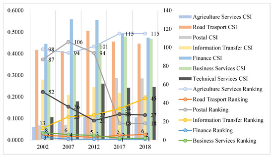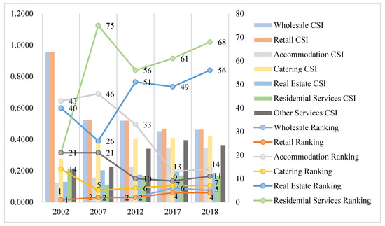From the overall view in Figure 13, the status of the life service industry is generally higher, but most of these exhibit a slight downward trend. Among them, the wholesale and retail industries dropped from rank 1 in 2002 to rank 5 and 4 in 2018. When the ranking changes of the financial and business service industries are compared, this reflects the optimization and upgrading of the internal industrial structure of China’s service industry—the transformation from a labor-intensive traditional service industry (wholesale and retail) to a knowledge-intensive modern service industry (financial and business services).